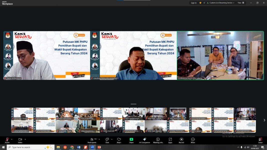 Kudus – Komisi Pemilihan Umum (KPU) Kabupaten Kudus mengikuti kajian rutin “Kamis Sesuatu” seri ke-19 yang membahas Putusan Perkara Nomor 70/PHPU.BUP-XXIII/2025 terkait Perselisihan Hasil Pemilihan Bupati dan Wakil Bupati Serang Tahun 2024, Kamis (18/9).