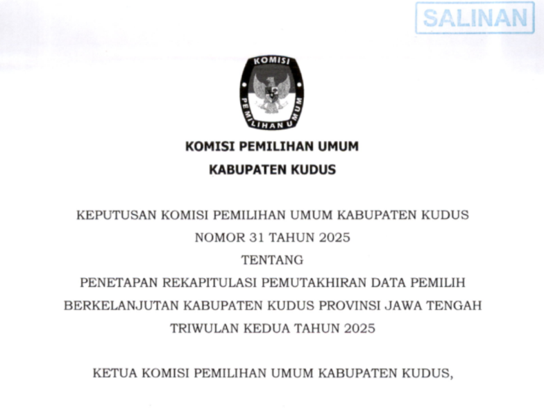 Keputusan Penetapan Rekapitulasi Pemutakhiran Data Pemilih Berkelanjutan Triwulan II Tahun 2025 Rabu, 15 Oktober 2025 10:02 5 31_SK Penetapan Rekapitulasi Pemutakhiran Data Pemilih Berkelanjutan Triwulan Kedua Tahun 2025 KPU Kudus 28_BA_Rekapitulasi Daftar Pemilih Berkelanjutan Triwulan Kedua Tahun 2025 KPU Kabupaten Kudus Bagikan: Dilihat 5 Kali.