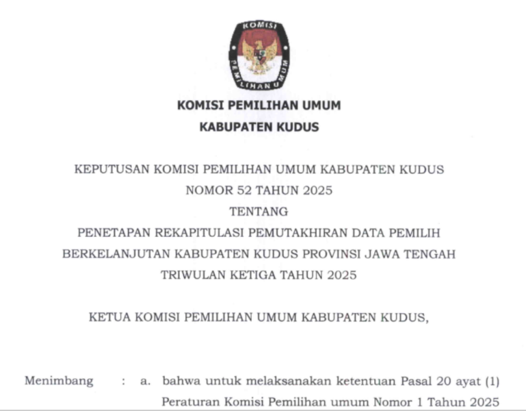 Keputusan Penetapan Rekapitulasi Pemutakhiran Data Pemilih Berkelanjutan Triwulan III Tahun 2025 Rabu, 15 Oktober 2025 10:09 5 52_SK Penetapan Rekapitulasi Pemutakhiran Data Pemilih Berkelanjutan Triwulan Ketiga Tahun 2025 KPU Kudus 51_BA_Rekapitulasi Daftar Pemilih Berkelanjutan Triwulan Ketiga Tahun 2025 KPU Kabupaten Kudus Bagikan: Dilihat 5 Kali.