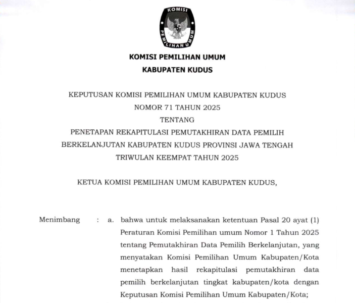 Keputusan Penetapan Rekapitulasi Pemutakhiran Data Pemilih Berkelanjutan Triwulan IV Tahun 2025 Senin, 08 Desember 2025 09:57 39 Keputusan Penetapan Rekapitulasi Pemutakhiran Data Pemilih Berkelanjutan Triwulan IV Tahun 2025 (unduh) BA Rekapitulasi Daftar Pemilih Berkelanjutan Triwulan IV Tahun 2025 KPU Kabupaten Kudus (unduh) Bagikan: Dilihat 39 Kali.