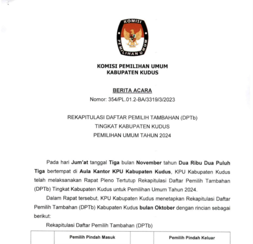 BA NOMOR 354/PL.01.2-BA/3319/2023 REKAPITULASI DPTB KABUPATEN KUDUS BULAN OKTOBER 2023 Sabtu, 04 November 2023 07:00 192 BA nomor 354/PL.01.2-BA/3319/2023 dapat diunduh (DI SINI) Bagikan: Dilihat 192 Kali.