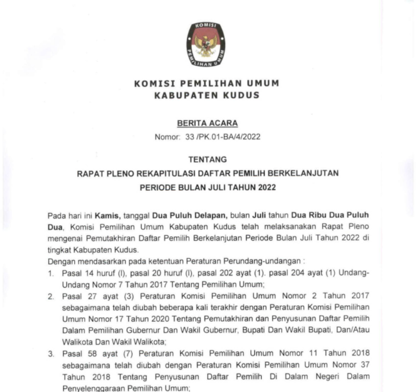 BERITA ACARA PLENO DAFTAR PEMILIH BERKELANJUTAN JULI 2022 Jumat, 29 Juli 2022 07:00 118 BERITA ACARA PLENO DAFTAR PEMILIH BERKELANJUTAN JULI 2022 silakan unduh (disini) MODEL A-DPB JULI 2022 silakan unduh (disini) Bagikan: Dilihat 118 Kali.