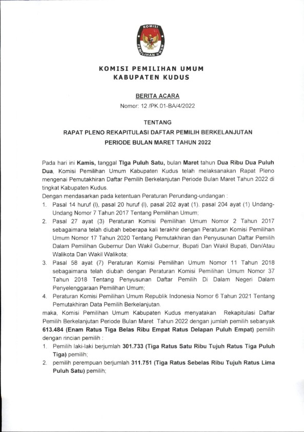 BERITA ACARA PLENO REKAPITULASI DAFTAR PEMILIH BERKELANJUTAN PERIODE MARET 2022
