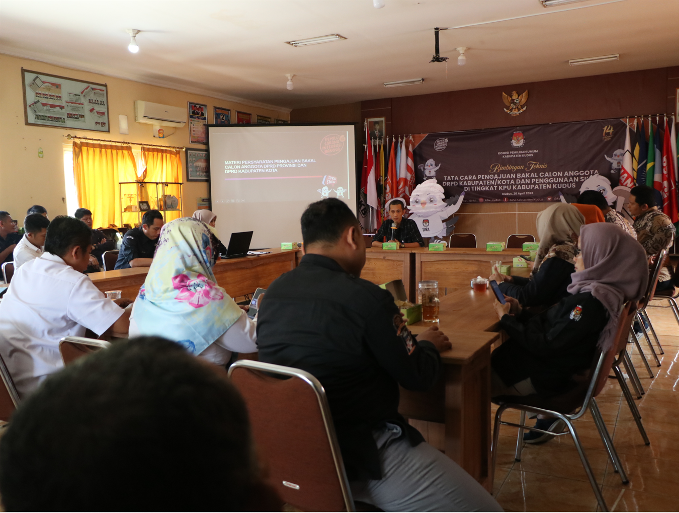 KUDUS - KPU Kabupaten Kudus melaksanakan Bimbingan Teknis Tata Cara Pengajuan Bakal Calon Anggota DPRD Kabupaten/Kota dan Penggunaan SILON di Tingkat KPU Kabupaten Kudus, Rabu (26/4). Bertempat di Aula KPU Kabupaten Kudus, adapun peserta Bimtek kali ini adalah seluruh pegawai KPU Kabupaten Kudus dan Bawaslu Kabupaten Kudus.