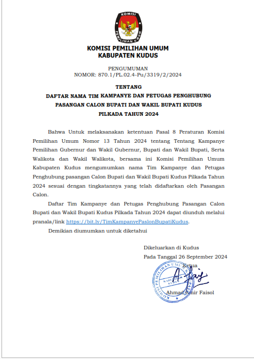 DAFTAR NAMA TIM KAMPANYE DAN PETUGAS PENGHUBUNG PASANGAN CALON BUPATI DAN WAKIL BUPATI KUDUS PILKADA TAHUN 2024 UNDUH DISINI