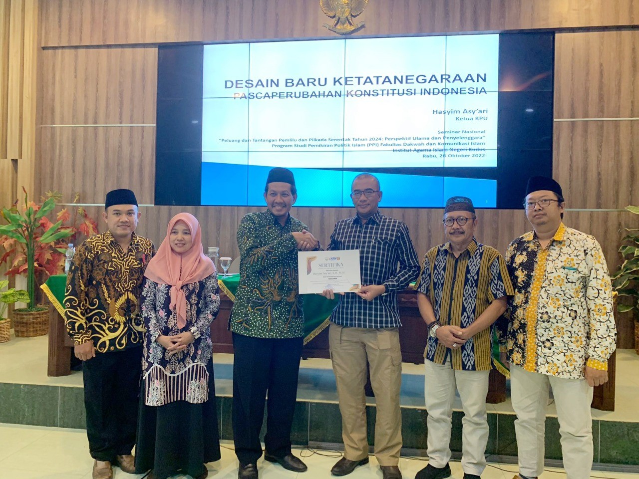 KUDUS-Ketua KPU RI Hasyim Asyari hadir sebagai narasumber dalam Seminar Nasional yang diselenggarakan oleh Fakultas Dakwah IAIN Kudus, Rabu (26/10). Seminar Nasional dengan tema Peluang dan Tantangan Pemilu dan Pilkada 2024 dalam Perspektif Ulama dan Penyelenggaran turut dihadiri oleh anggota KPU Provinsi Jawa Tengah Henry Wahyono, Ketua KPU Kabupaten Kudus Naily Syarifah beserta anggota KPU Kabupaten Kudus Ahmad Kholil.