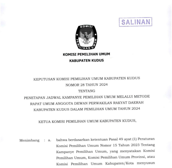KEPUTUSAN KPU KABUPATEN KUDUS NOMOR 28 TAHUN 2024 TENTANG PENETAPAN JADWAL KAMPANYE PEMILIHAN UMUM METODE KAMPANYE RAPAT UMUM ANGGOTA DPRD KABUPATEN KUDUS DALAM PEMILU 2024