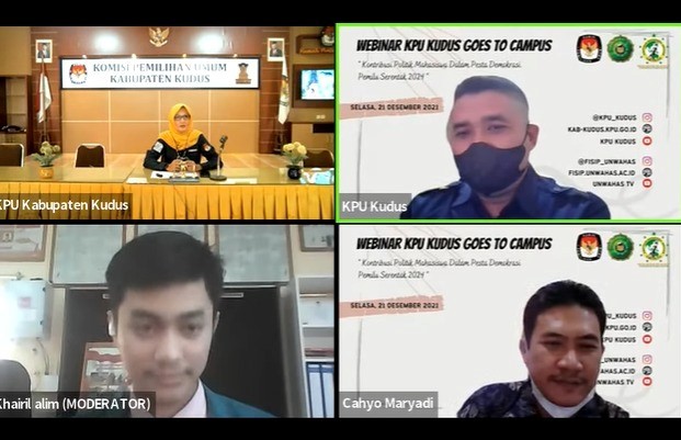 Kudus- Di penghujung tahun ini, Komisi Pemilihan Umum (KPU) Kabupaten Kudus kembali menyelenggarakan Webinar KPU Goes To Campus, Selasa (21/12). Bekerja sama dengan mahasiswa magang dari Fakultas Ilmu Sosial dan Ilmu Politik Universitas Wahid Hasyim Semarang, webinar kali ini mengangkat tema “Kontribusi Politik Mahasiswa Dalam Pesta Demokrasi Pemilu Serentak 2024.”