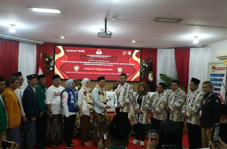 KUDUS - KPU Kabupaten Kudus menerima Pendaftaran Pasangan Calon Bupati dan Wakil Bupati Kudus Tahun 2024, Drs. Ars. Sam’ani Intakoris, S.T., M.T. dan Bellinda Putri Sabrina Birton, S.Ked pada hari Rabu (28/8) pukul 14.45 WIB.