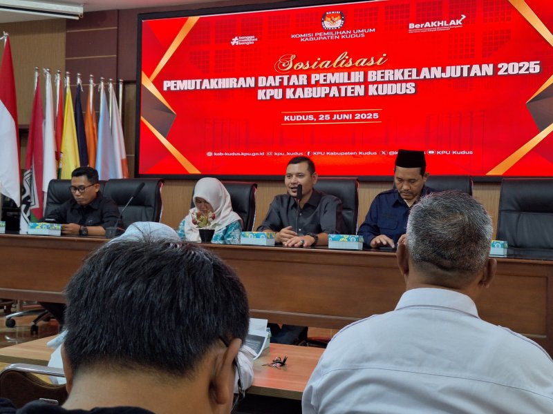 KPU Kabupaten Kudus melaksanakan kegiatan sosialisasi Pemutakhiran Daftar Pemilih Berkelanjutan (PDPB) Tahun 2025, berlangsung di aula KPU Kabupaten Kudus, Rabu (25/6).