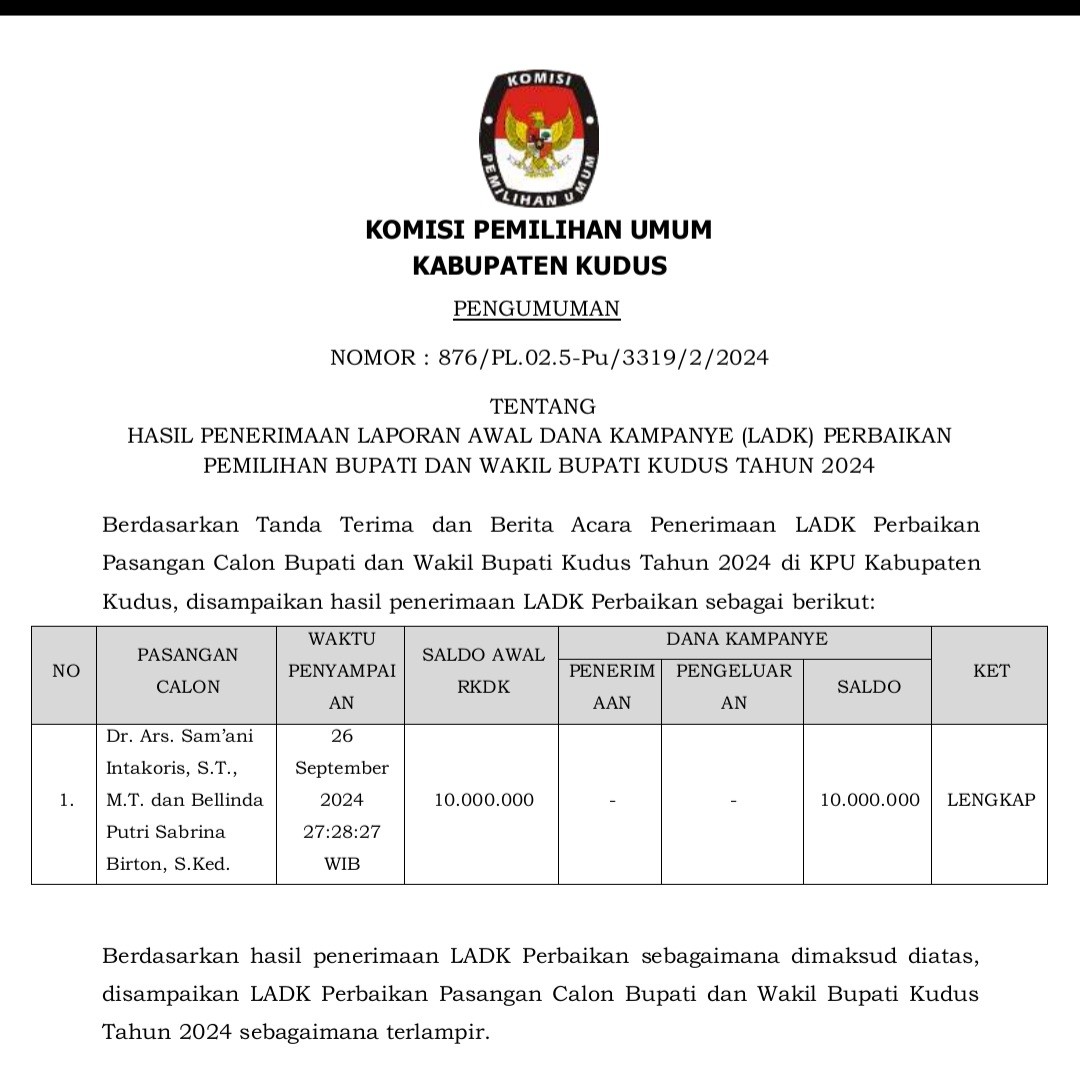 LAPORAN AWAL DANA KAMPANYE PERBAIKAN Sabtu, 28 September 2024 14:00 107 Penguman Laporan Awal Dana Kampanye Perbaikan unduh (DISINI) Bagikan: Dilihat 107 Kali.