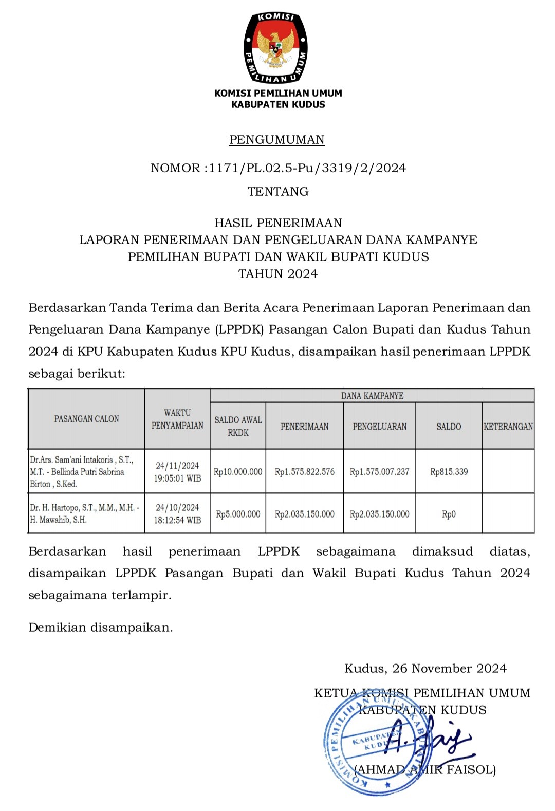 LPPDK CALON BUPATI DAN WAKIL BUPATI KABUPATEN KUDUS TAHUN 2024 Selasa, 26 November 2024 20:00 475 Dokumen dapat unduh (disini) Bagikan: Dilihat 475 Kali.
