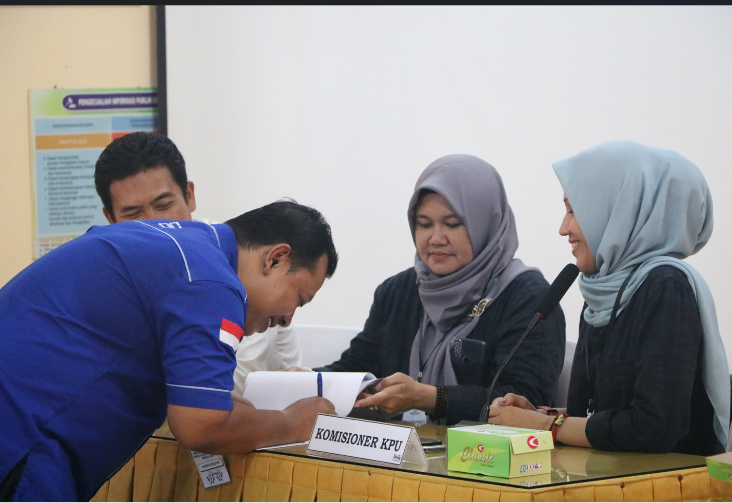 Selesai pemeriksaan dokumen, Naily menyampaikan hasil dan menyerahkan tanda terima berikut Berita Acara hasil pemeriksaan kepada Ketua Partai. Pada sesi akhir pengajuan, kedua partai melakukan press conference yang telah disediakan oleh KPU Kudus. (humas)