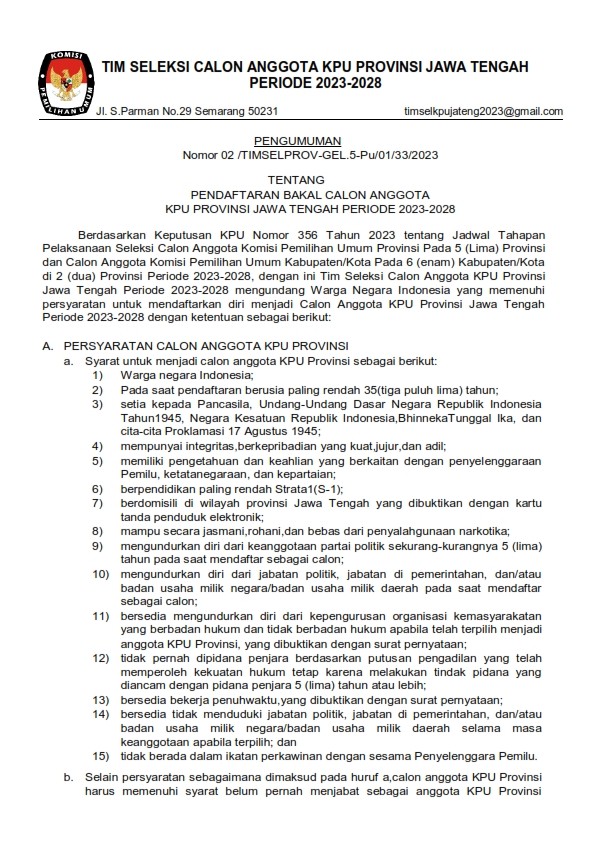 PENDAFTARAN BAKAL CALON ANGGOTA KPU PROVINSI JAWA TENGAH PADA PERIODE 2023-2028 DAPAT MENGUNDUH PENGUMUMAN DISINI