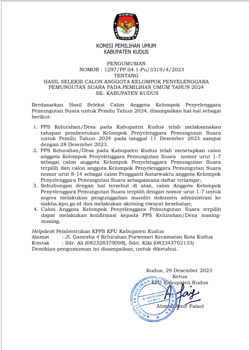 Pengumuman Hasil Seleksi KPPS pada Pemilihan Umum Tahun 2024 Unduh Disini