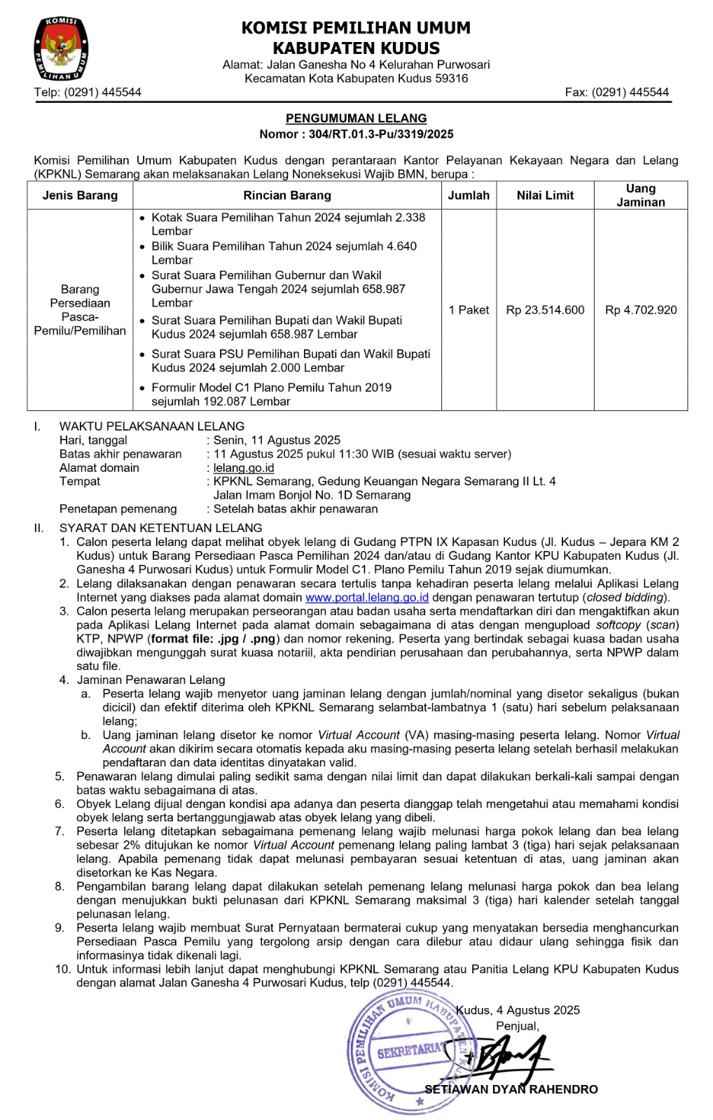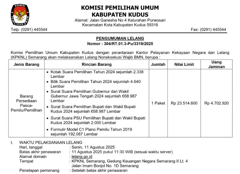 Pengumuman Lelang Barang Persediaan Pasca Pemilu/Pemilihan KPU Kabupaten Kudus