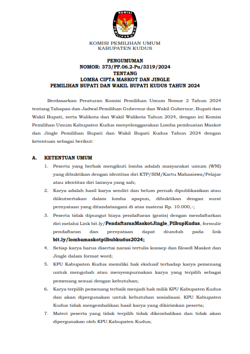 PENGUMUMAN LOMBA CIPTA MASKOT DAN JINGLE PEMILIHAN BUPATI DAN WAKIL BUPATI KUDUS TAHUN 2024 Minggu, 07 April 2024 07:00 137 ENGUMUMAN LOMBA CIPTA MASKOT DAN JINGLE PEMILIHAN BUPATI DAN WAKIL BUPATI KUDUS TAHUN 2024 UNDUH LINK PENDAFTARAN KLIK FORMULIR PENDAFTARAN UNDUH Bagikan: Dilihat 137 Kali.