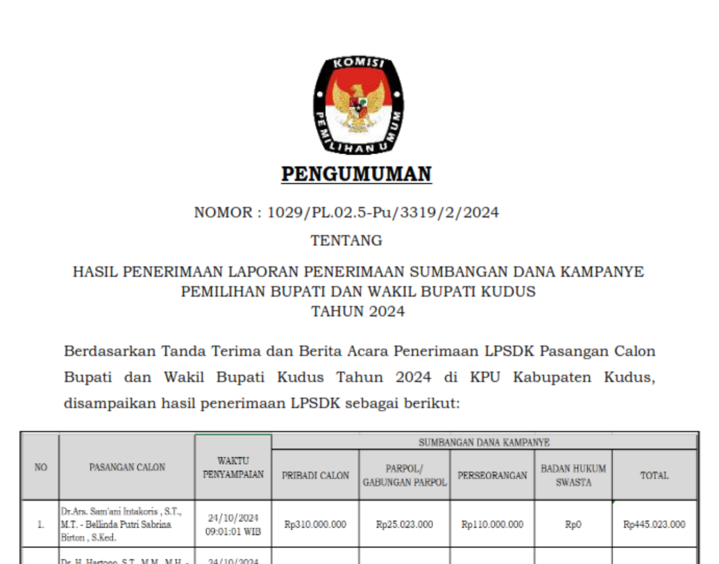 PENGUMUMAN LPSDK PEMILU BUPATI DAN WAKIL BUPATI KUDUS TAHUN 2024 Sabtu, 26 Oktober 2024 07:00 441 Pengumuman LPSDK dapat diunduh (disini) Bagikan: Dilihat 441 Kali.