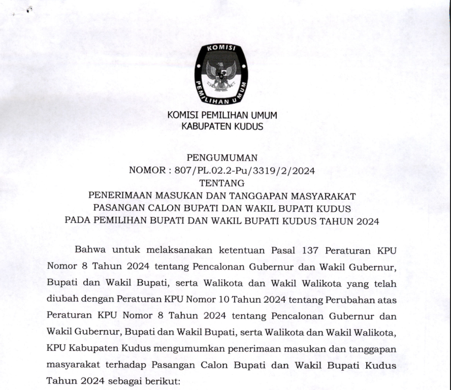 Pengumuman Penerimaan Masukan dan Tanggapan Masyarakat Terhadap Calon Bupati dan Wakil Bupati Kudus pada Pemilihan Bupati dan Wakil Bupati Kudus Tahun 2024 lihat
