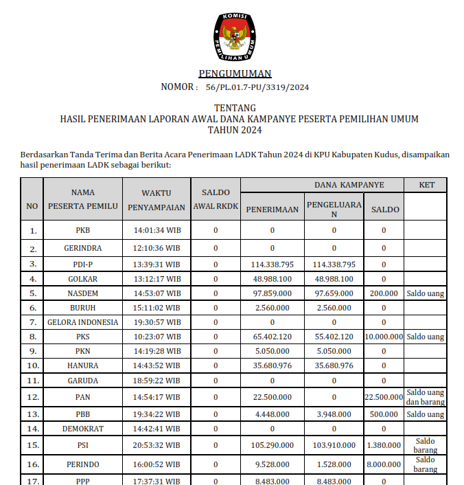PENGUMUMAN NO: 56/PL.01.7-PU/3319/2024 TENTANG HASIL PENERIMAAN LAPORAN AWAL DANA KAMPANYE PESERTA PEMILIHAN UMUM TAHUN 2024