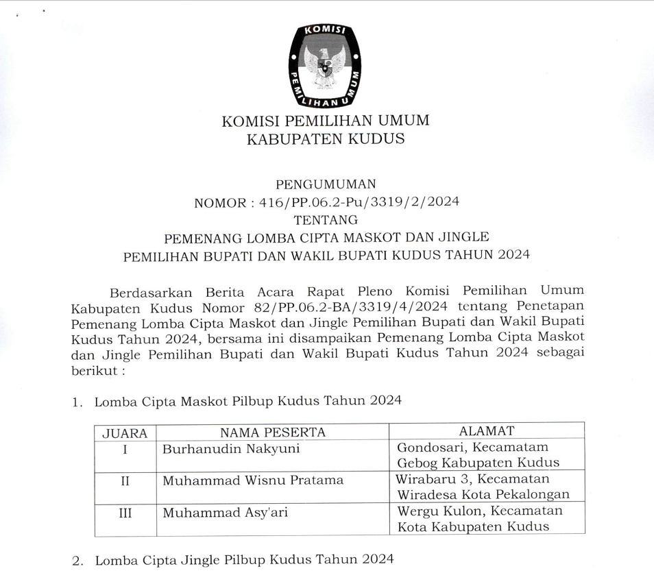 PENGUMUMAN NO.416/PP.06.2-Pu/3319/2/2024 TENTANG PEMENANG LOMBA CIPTA MASKOT DAN JINGLE PILBUP 2024