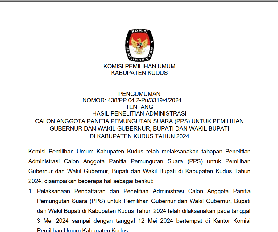 PENGUMUMAN NOMOR 438/PP.04.2-Pu/3319/4/2024 TENTANG HASIL PENELITIAN ADMINITRASI CALON ANGGOTA PPS PEMILU GUBERNUR DAN WAKIL GUBERNUR, BUPATI DAN WAKIL BUPATI DI KABUPATEN KUDUS TAHUN 2024