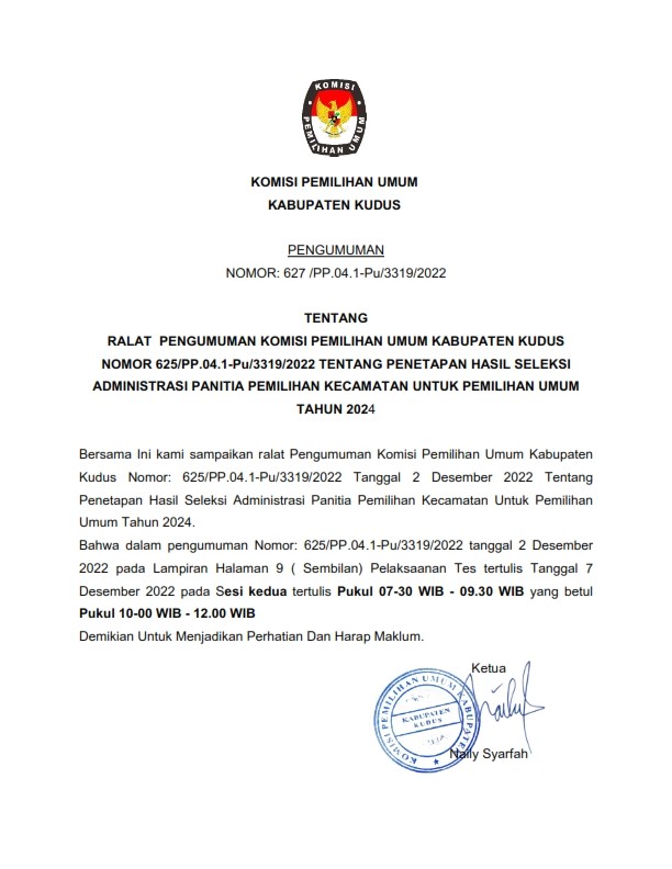 PENGUMUMAN NOMOR: 627 /PP.04.1-Pu/3319/2022 Minggu, 04 Desember 2022 07:00 315 lampiran pengumuman bisa diunduh (disini) Bagikan: Dilihat 315 Kali.