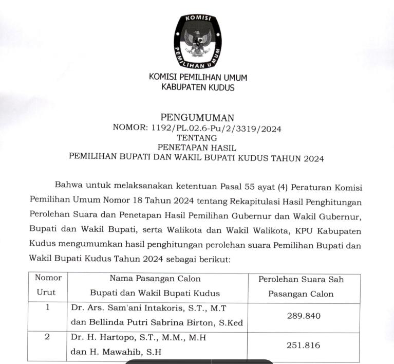 PENGUMUMAN PENETAPAN HASIL PEMILIHAN BUPATI DAN WAKIL BUPATI KUDUS TAHUN 2024 Rabu, 04 Desember 2024 15:00 621 Dokumen dapat diunduh (di sini) Bagikan: Dilihat 621 Kali.