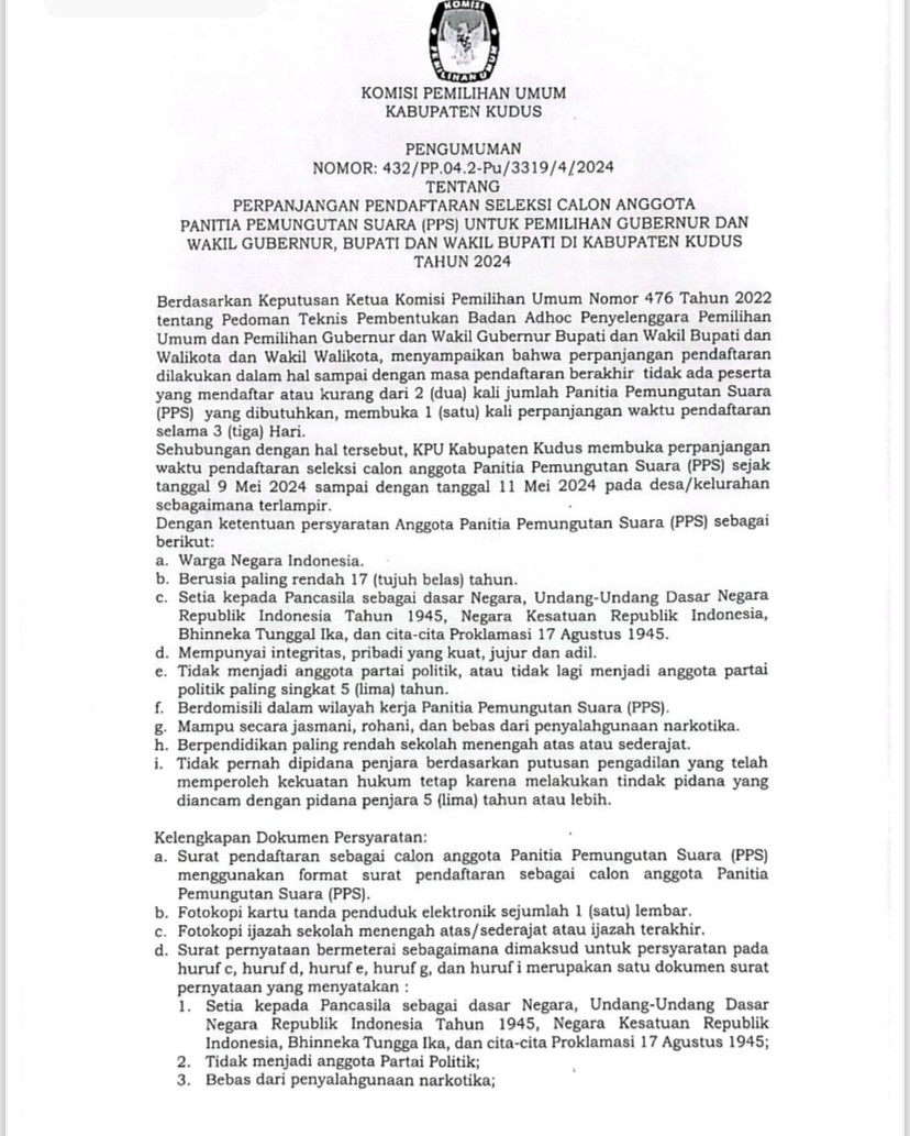 PENGUMUMAN PERPANJANGAN PENDAFTARAN PPS UNTUK PEMILIHAN GUBERNUR DAN WAKIL GUBERNUR, BUPATI DAN WAKIL BUPATI DI KABUPATEN KUDUS TAHUN 2024 UNDUH
