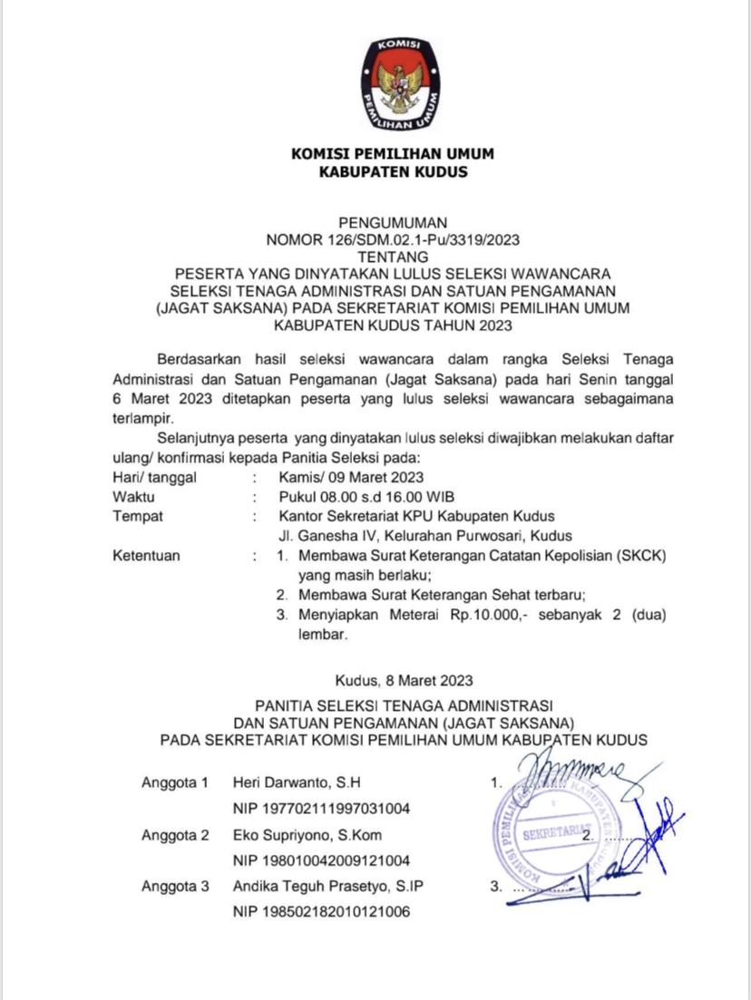 PENGUMUMAN PESERTA YANG DINYATAKAN LOLOS SELEKSI WAWANCARA TENAGA ADMINISTRASI DAN SATUAN PENGAMANAN (JAGAT SAKSANA)