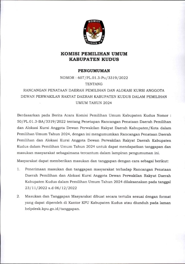 PENGUMUMAN RANCANGAN PENATAAN DAERAH PEMILIHAN DAN ALOKASI KURSI ANGGOTA DEWAN PERWAKILAN RAKYAT DAERAH KABUPATEN KUDUS DALAM PEMILIHAN UMUM TAHUN 2024