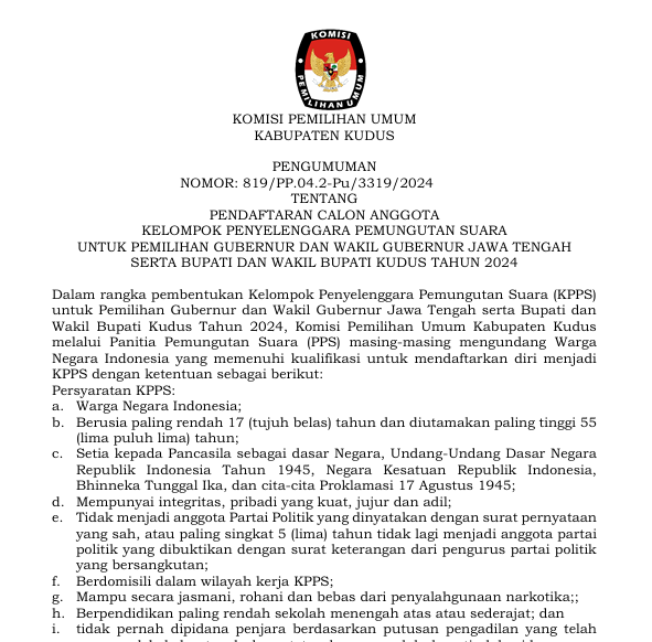 PENGUMUMAN SELEKSI ANGGOTA KPPS PILKADA SERENTAK 2024 Selasa, 17 September 2024 08:03 785 Pengumuman Seleksi Calon Anggota Kelompok Penyelenggara Pemungutan Suara (KPPS) untuk Pilkada Serentak 2024 bisa dilihat disini Dokumen Persyaratan Pendaftaran KPPS bisa diunduh disini Bagikan: Dilihat 785 Kali.