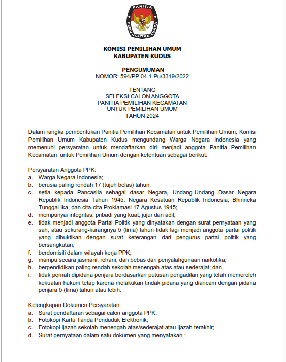 Pengumuman Seleksi Calon Anggota Panitia Pemilihan Kecamatan Pemilu 2024 Minggu, 20 November 2022 06:00 1122 Selengkapnya klik Download Bagikan: Dilihat 1,122 Kali.