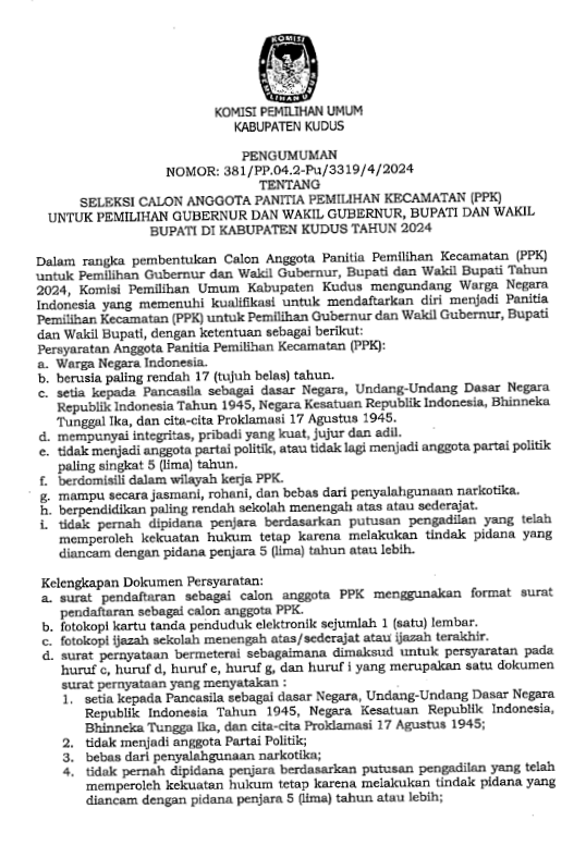 PENGUMUMAN SELEKSI CALON ANGGOTA PANITIA PEMILIHAN KECAMATAN (PPK) UNTUK PILKADA TAHUN 2024 Selasa, 23 April 2024 12:00 1204 PENGUMUMAN SELEKSI CALON ANGGOTA PANITIA PEMILIHAN KECAMATAN (PPK) UNTUK PEMILIHAN GUBERNUR DAN WAKIL GUBERNUR, BUPATI DAN WAKIL BUPATI DI KABUPATEN KUDUS TAHUN 2024 UNDUH Form Surat Pendaftaran, Surat Pernyataan dan Daftar Riwayat Hidup Unduh Bagikan: Dilihat 1,204 Kali.
