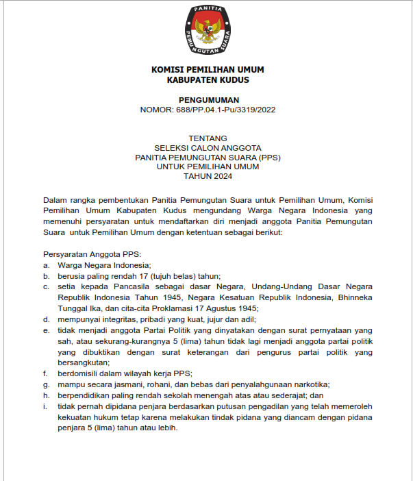 Pengumuman Seleksi Calon Anggota Panitia Pemungutan Suara (PPS) Pemilu Tahun 2024