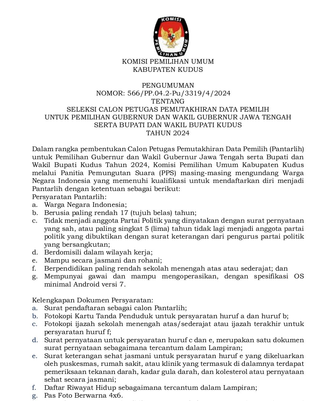 PENGUMUMAN SELEKSI CALON PETUGAS PANTARLIH PILKADA SERENTAK 2024