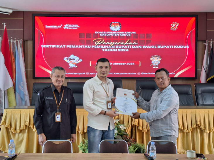 Sertifikat Pemantau tersebut diserahkan langsung oleh Ketua KPU Kabupaten Kudus, Ahmad Amir Faisol dengan didampingi oleh Sekretaris KPU Kabupaten Kudus, Da’faf Ali.