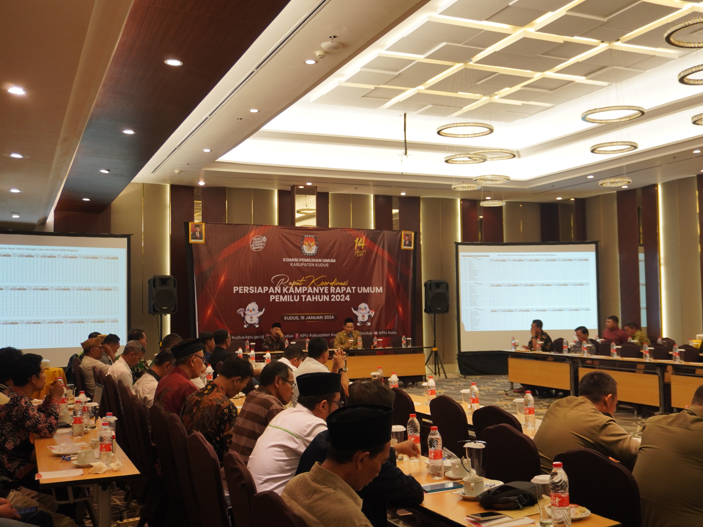 KUDUS - KPU Kabupaten Kudus melaksanakan kegiatan Rapat Koordinasi Persiapan Kampanye Rapat Umum Pemilu Tahun 2024, berlangsung di Hotel @hom Kudus, Kamis (18/1).