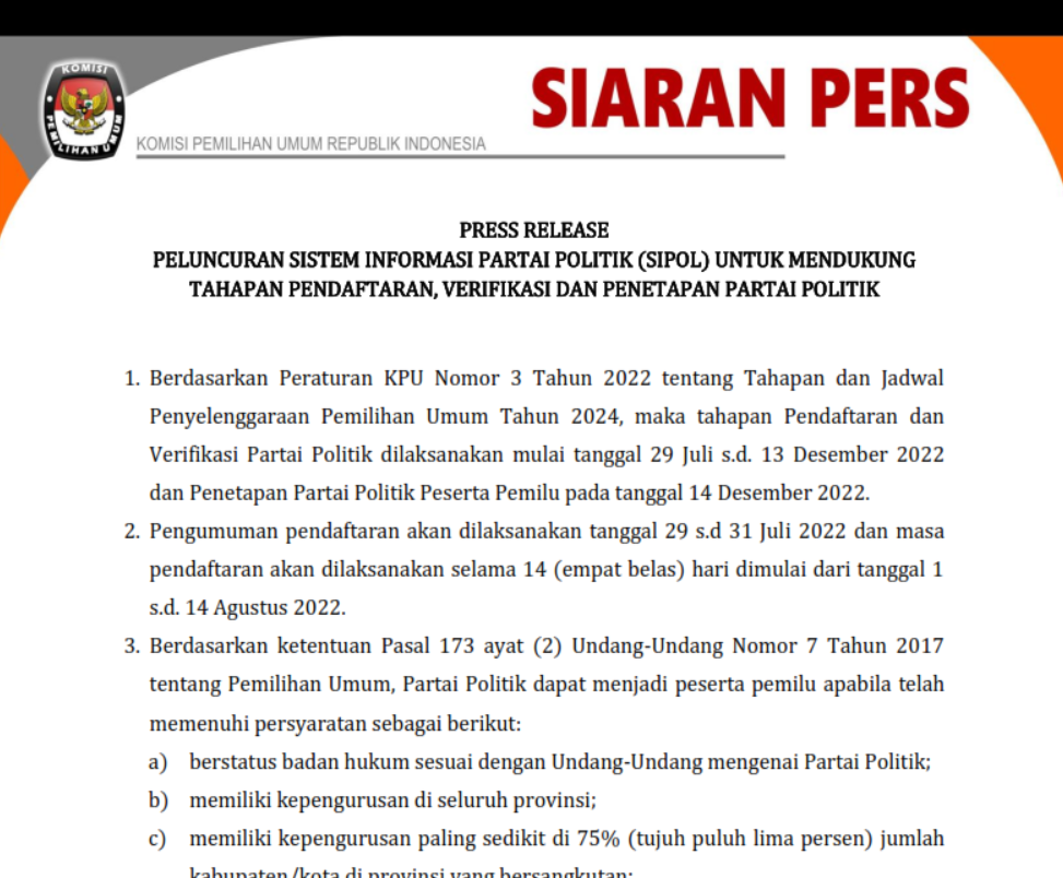 PRESS RELEASE PELUNCURAN SISTEM INFORMASI PARTAI POLITIK (SIPOL) UNTUK MENDUKUNG TAHAPAN PENDAFTARAN, VERIFIKASI DAN PENETAPAN PARTAI POLITIK