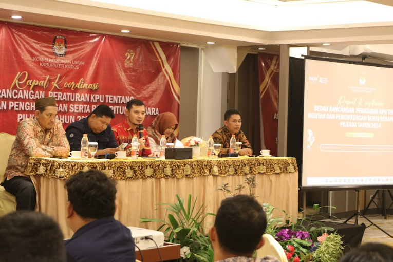 Divisi Sosdiklih, Parmas & SDM KPU Kabupaten Kudus menyampaikan KPU Kabupaten Kudus telah menfasilitasi bahan Kampanye berupa Baliho, Spanduk, Flyer/Selebaran, Brosur, Pamflet, Poster. Divisi Teknis KPU Kabupaten Kudus Ahmad Kholil memaparkan tentang draf PKPU tentang Pemungutan dan Penghitungan serta Rekapitulasi Suara Pilkada tahun 2024 setiap pasal., (humas).