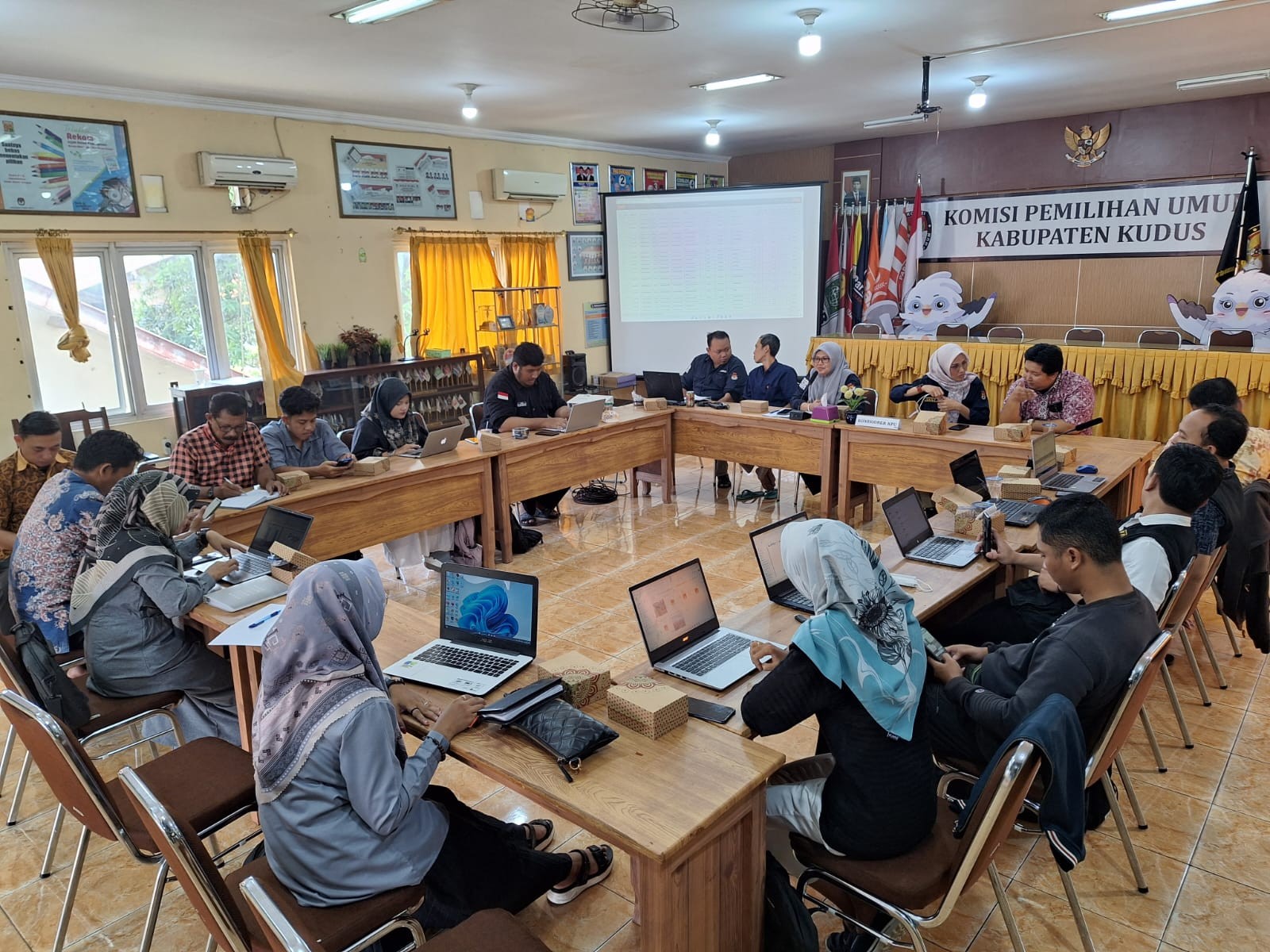 KUDUS - KPU Kabupaten Kudus melaksanakan Rapat Koordinasi dan Sinkronisasi Data untuk Daftar Pemilih Sementara Hasil Perbaikan (DPSHP) Akhir tingkat PPS dan PPK pada Pemilu 2024, Selasa (30/5). bertempat di Aula KPU Kabupaten Kudus, Rakor diikuti oleh Ketua dan Anggota PPK Divisi Rendatin.
