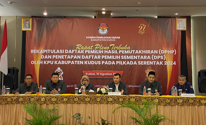 KUDUS - KPU Kabupaten Kudus melaksanakan Rapat Pleno Terbuka Rekapitulasi Daftar Pemilih hasil Pemutakhiran (DPHP) dan Penetapan Daftar Pemilih Sementara (DPS) tingkat KPU Kabupaten Kudus pada penyelenggaraan pemilihan Gubernur dan wakil gubernur Jawa Tengah serta Bupati dan wakil Bupati Kudus tahun 2024, berlangsung di Hotel @hom Kudus, Sabtu (10/8).