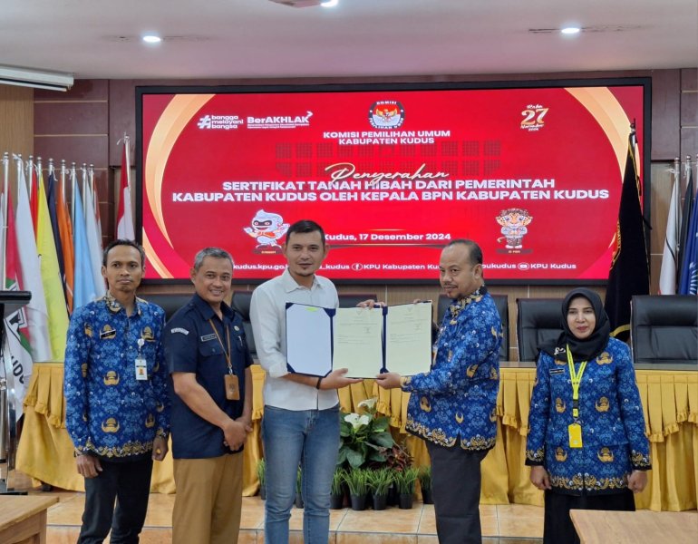 KPU Kabupaten Kudus menerima Penyerahan Sertifikat Tanah Hibah dari Pemerintah Kabupaten Kudus oleh Kepala BPN Kabupaten Kudus, Selasa (17/12).