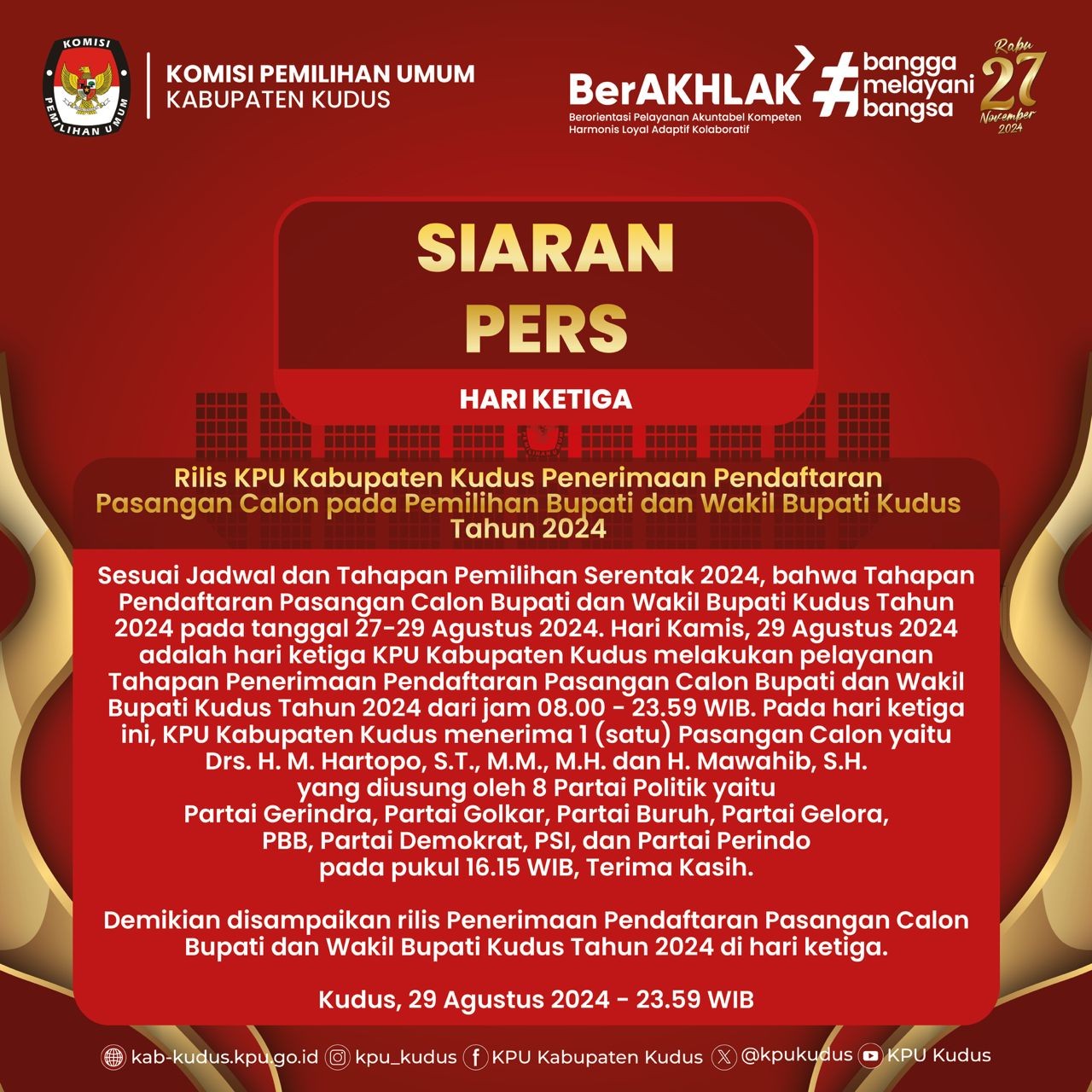 SIARAN PERS HARI KE 3 PENERIMAAN BAKAL CALON BUPATI DAN WAKIL BUPATI KUDUS 2024 Kamis, 29 Agustus 2024 20:00 350 SIARAN PERS (UNDUH) Bagikan: Dilihat 350 Kali.