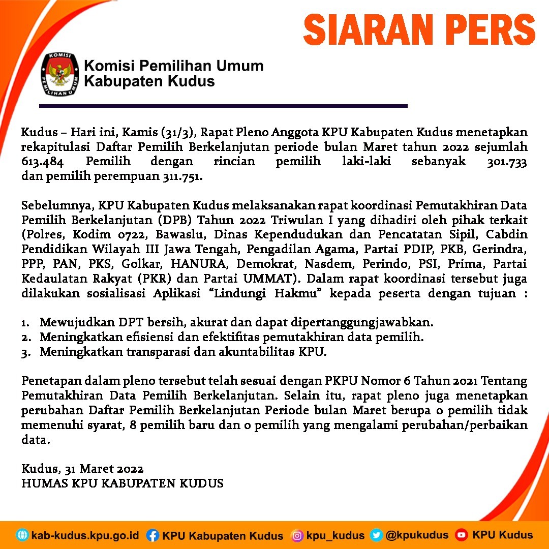 SIARAN PERS PEMUTAKHIRAN DAFTAR PEMILIH BERKELANJUTAN PERIODE MARET 2022