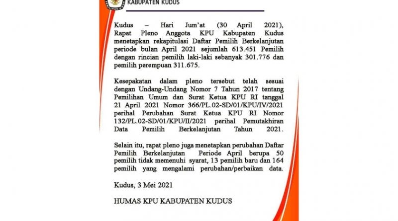 SIARAN PERS PEMUTAKHIRAN DATA PEMILIH BERKELANJUTAN PERIODE BULAN APRIL 2021 Sabtu, 01 Januari 2022 20:22 347 DOWNLOAD Bagikan: Dilihat 347 Kali.