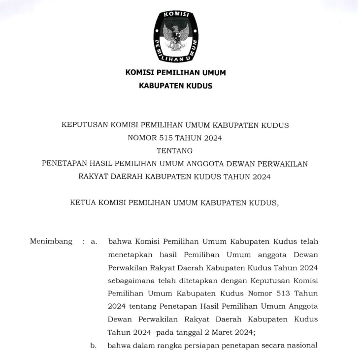 SK NOMOR 515 TENTANG PENETAPAN HASIL PEMILIHAN UMUM ANGGOTA DEWAN PERWAKILAN RAKYAT DAERAH KABUPATEN KUDUS TAHUN 2024 bisa unduh (DISNI)