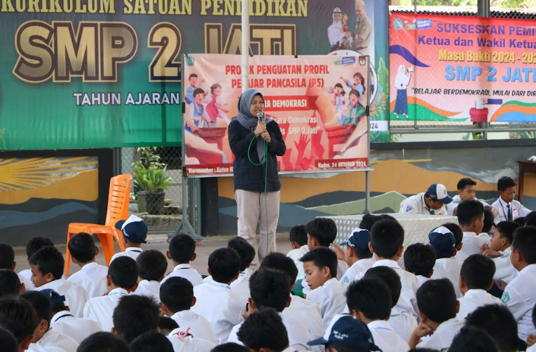 KUDUS - KPU Kabupaten Kudus menjadi narasumber dalam kegiatan Projek Penguatan Profil Pelajar Pancasila (P5) di SMP 2 Jati Kudus, Kamis (24/10).