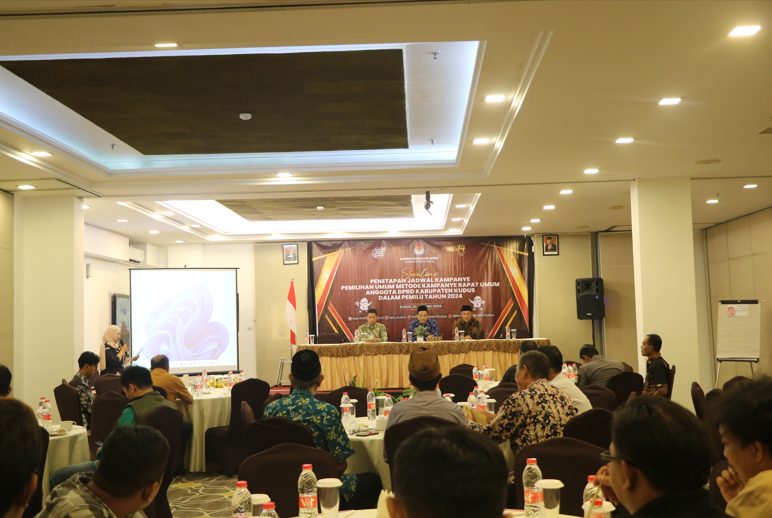 KUDUS - KPU Kabupaten Kudus melaksanakan kegiatan Sosialisasi Penetapan Jadwal Kampanye Pemilihan Umum Metode kampanye Rapat Umum Anggota DPRD Kabupaten Kudus dalam Pemilu Tahun 2024, berlangsung di Hotel @hom Kudus, Sabtu (20/1).